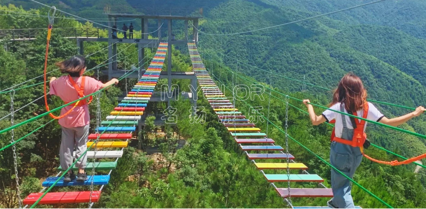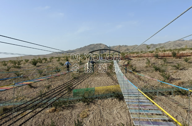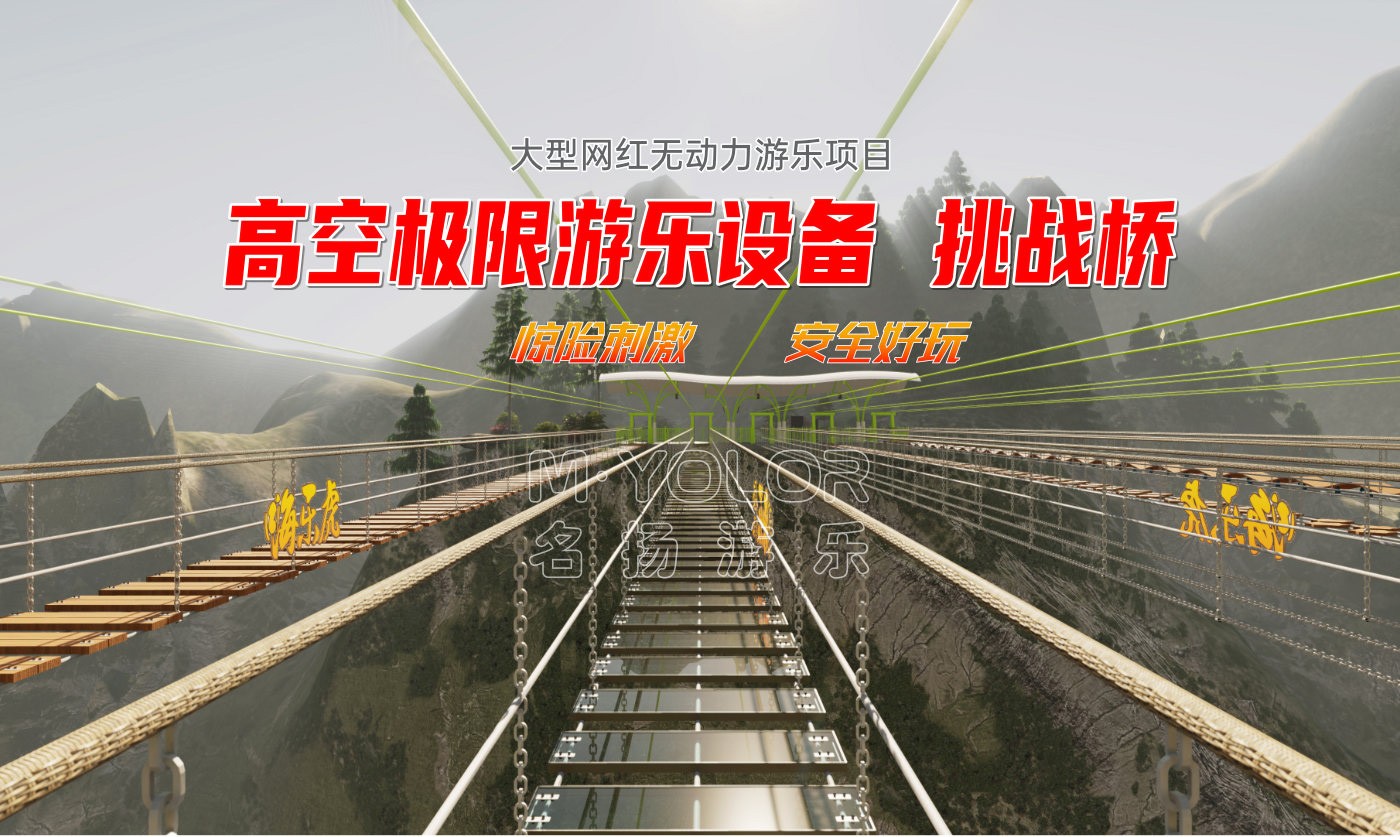 步步驚心挑戰(zhàn)橋包括兩種:緬甸橋和鐵索橋;緬甸橋是通過承載索、保護(hù)索及手扶索組成的橋,可間隔鋪設(shè)木板或玻璃;鐵索橋是由鐵鏈和鋼絲繩組成的橋;在高空中行走,驚險(xiǎn)又刺激。建在懸崖外的鏤空平臺(tái),鏤空平臺(tái)之間的寬度從半步可以跨過去的寬度到一大步跨越的寬度,驚險(xiǎn)刺激程度也是逐步升級(jí)。每一步都是驚心動(dòng)魄的,每一步都是一個(gè)挑戰(zhàn),下面是萬丈深淵,走在上面的可謂是真正的“步步驚心”。